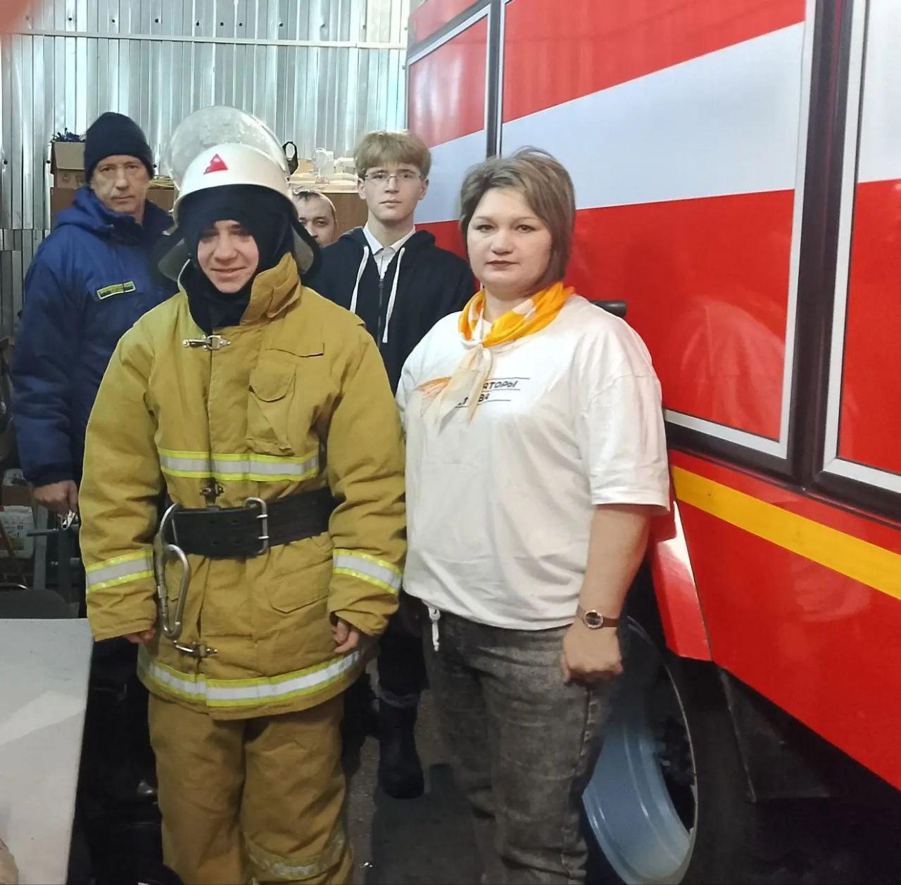 Ребятам предоставили возможность померить на себе спецодежду МЧС, посидеть в кабине за рулем пожарной машины.